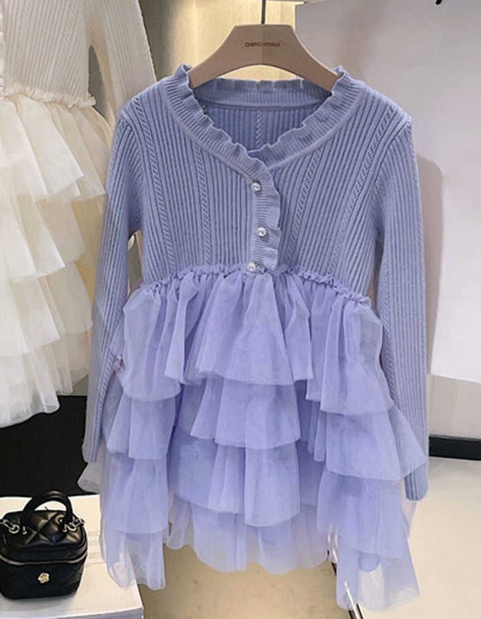 【Highlights】 Long sleeve knit sweater dress with ruffle collar, gathered tulle skirt, and softest tulle netting